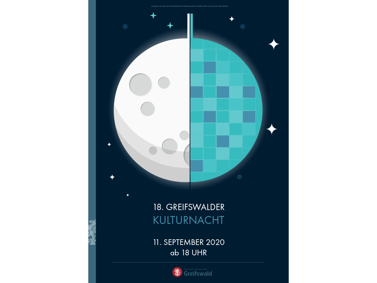 Dies ist ein Plakat für die Greifswalder Kulturnacht. Da es sich um ein festliches Ereignis handelt, habe ich eine Diskokugel als Symbol für ein Event illustriert. Die Illustration des Mondes steht für die Nacht. Beide Elemente habe ich zu einem Motiv zusammengefügt, sodass das Plakat die Veranstaltung stimmig widerspiegelt.